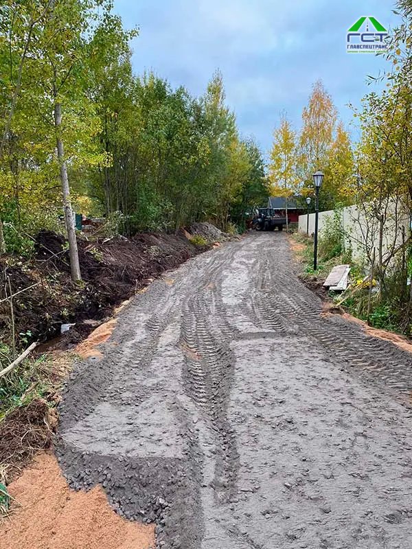 Вы здесь: ДСК ГЛАВСПЕЦТРАНС / Наши работы / Строительство дороги в посёлке Первомайское Площадь проведения работ: 300 м2; Срок выполнения: 2 дня. Выполненные работы: выемка верхнего слоя (торфогрунт 1 метр); укладка геотекстиля; укладка трубы 6 метров диаметр 300; отсыпка основания из песка с последующим уплотнением; укладка щпс 0/40 слой 15 см с послед уплотнением; устройство канавы.
