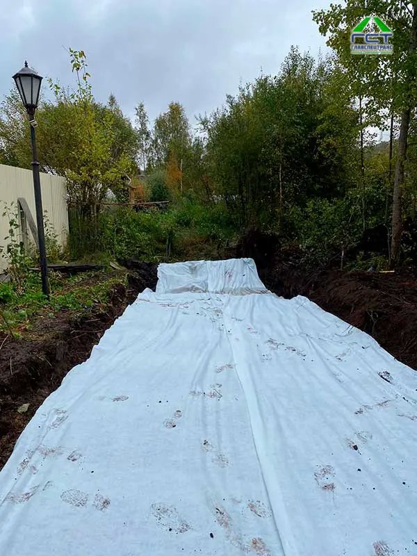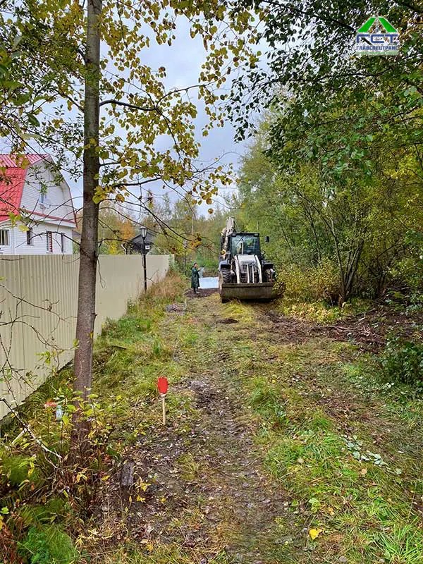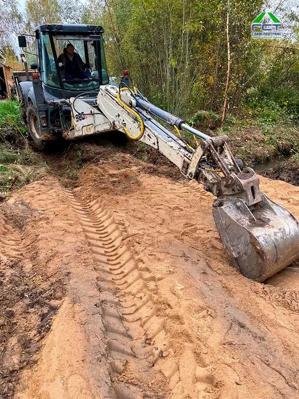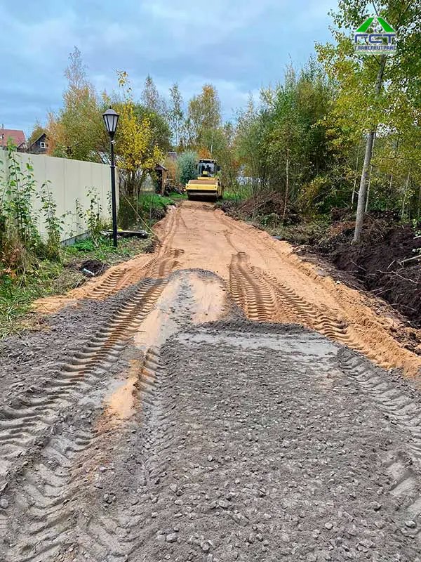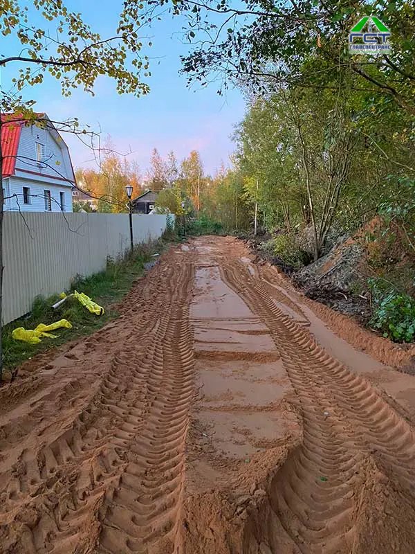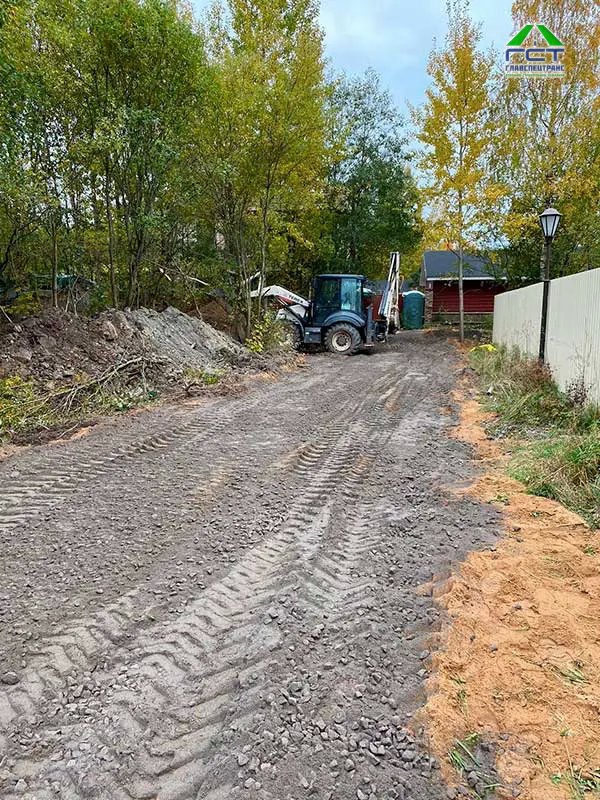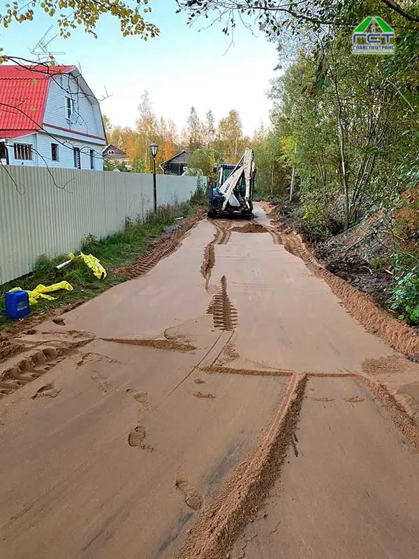 Площадь проведения работ: 300 м2; Срок выполнения: 2 дня. Выполненные работы: выемка верхнего слоя (торфогрунт 1 метр); укладка геотекстиля; укладка трубы 6 метров диаметр 300; отсыпка основания из песка с последующим уплотнением; укладка щпс 0/40 слой 15 см с послед уплотнением; устройство канавы.